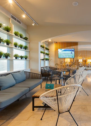Zeit für sich selbst. Für ein Erfrischungsgetränk, einen Kaffee, einen Cocktail, ein Eis oder einen Snack. Die Bar, die Sie brauchen, mit Terrasse und TV-Bildschirmen.