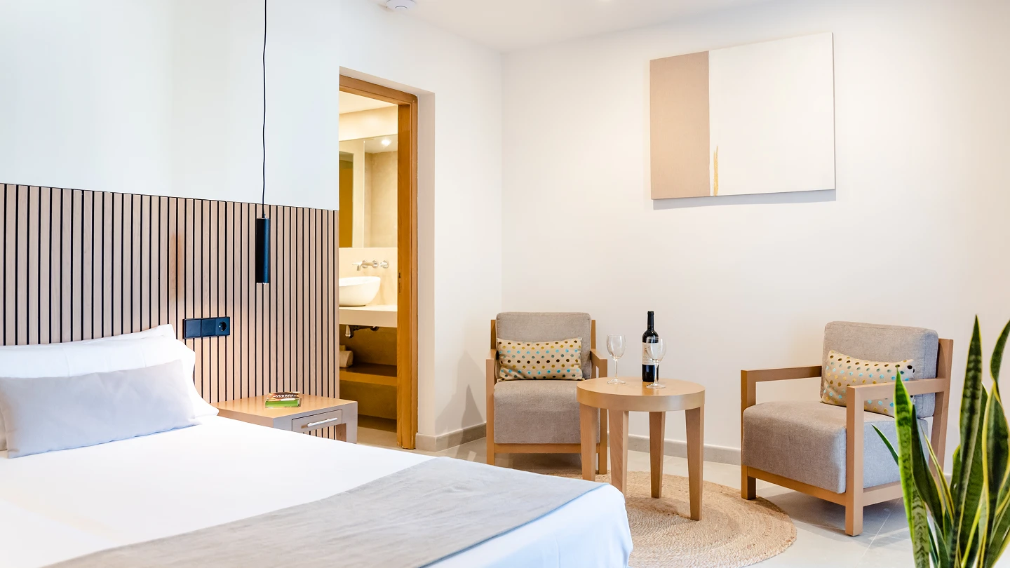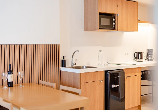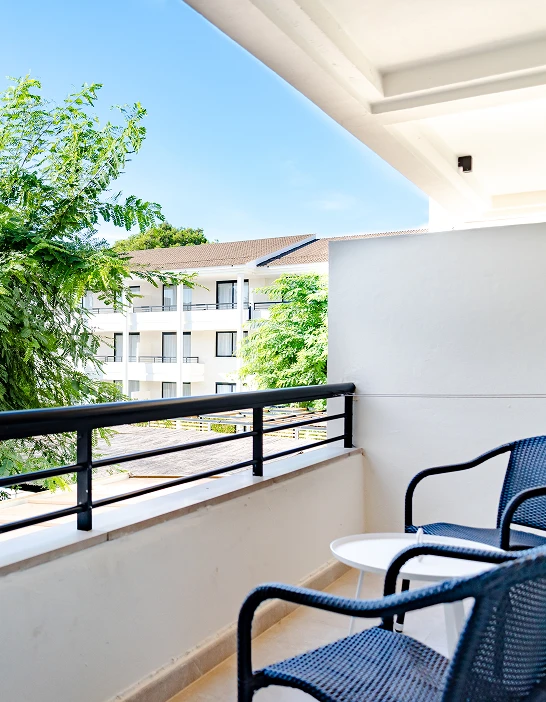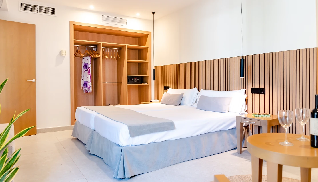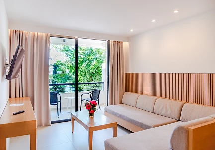 50 m² ApartmentFeaturing a double bedroom with two single beds, equipped with a 32” TV and safe. It includes a living room with a double sofa bed, 40” Smart TV, and an open-plan kitchen with refrigerator, microwave, and kettle. The en-suite bathroom offers a walk-in shower, hairdryer, and amenities. The apartment also has a balcony overlooking the hotel’s pool terrace. Wi-Fi and air conditioning are included.These apartments are located on the first and second floors of the hotel.