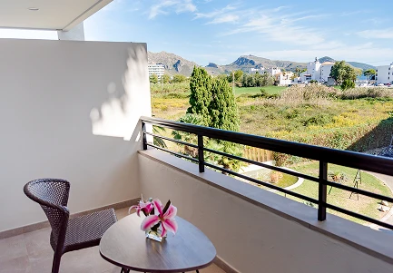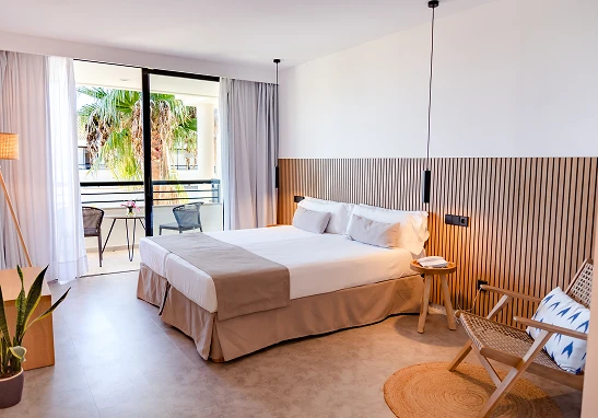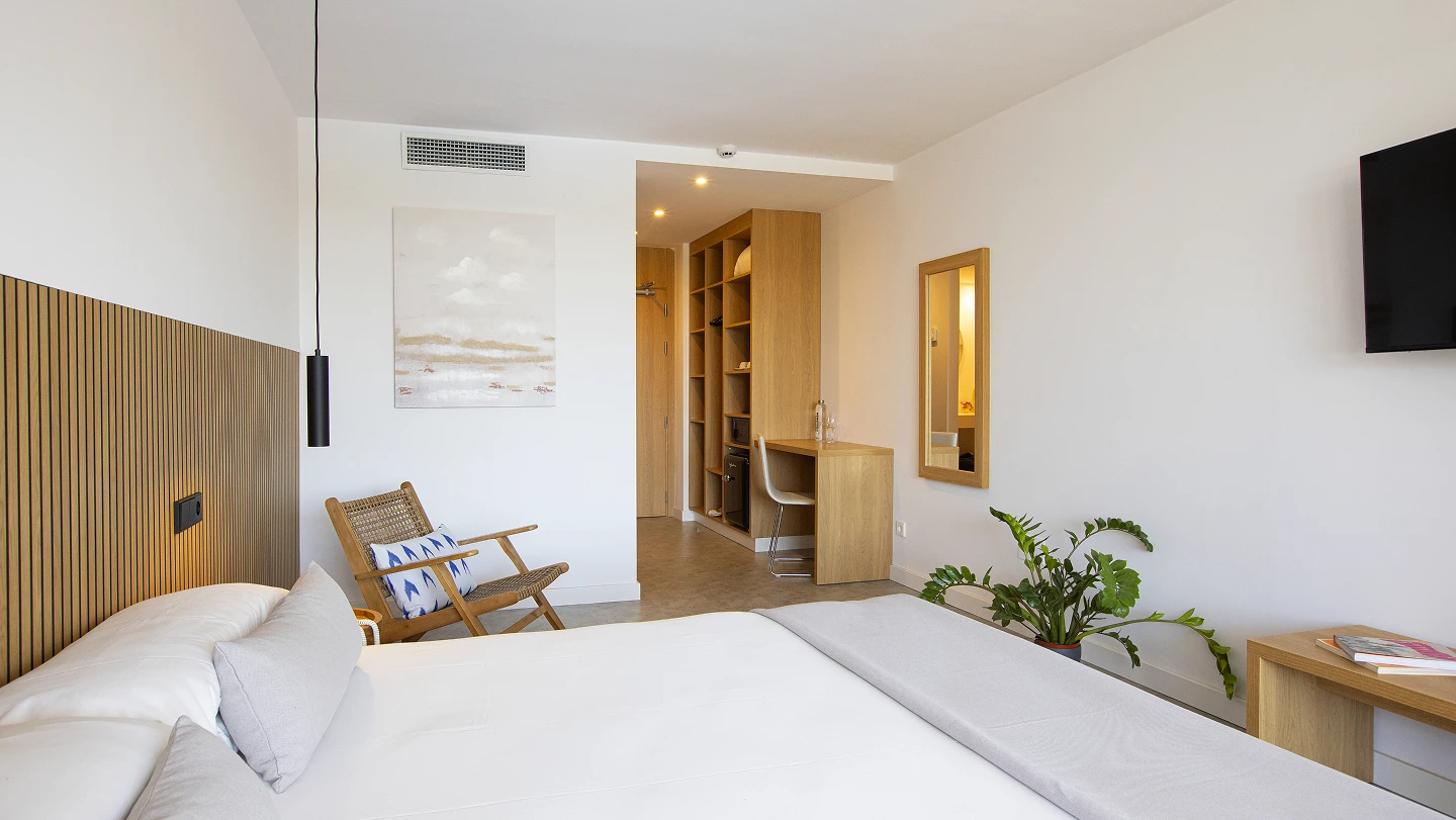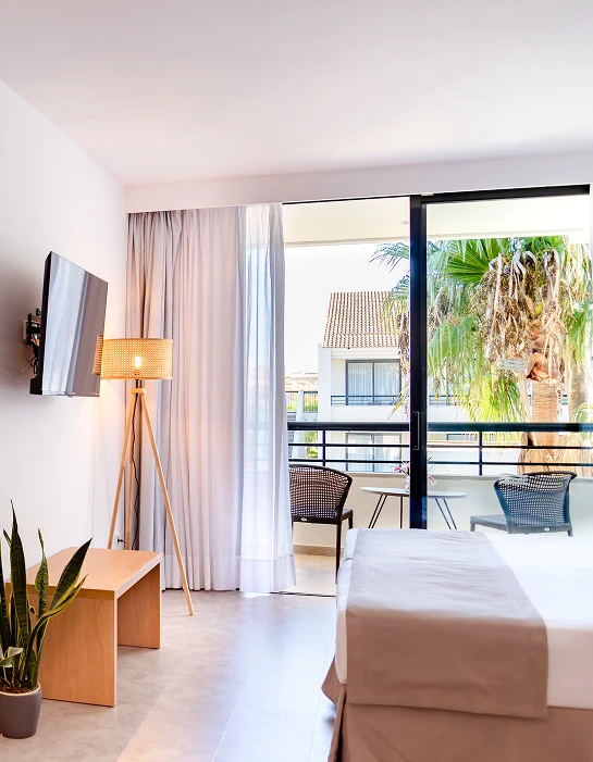 Habitación doble de 29m2 con dos camas individuales, equipada con mininevera y hervidor. Escritorio y Smart TV de 40”. El baño dispone de ducha a ras de suelo, secador y amenities. Todas las habitaciones tienen balcón con vistas a los jardines de la entrada del hotel. Dispone de caja fuerte, wifi y aire acondicionado. Estas habitaciones están situadas en planta baja, primera y segunda planta del hotel.