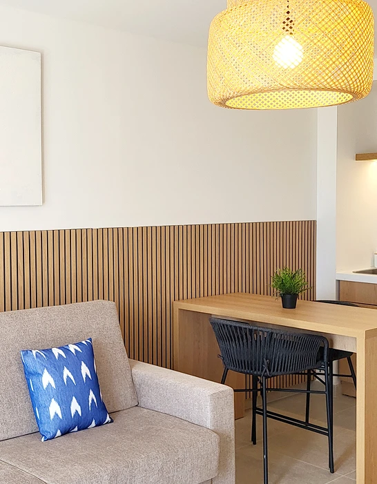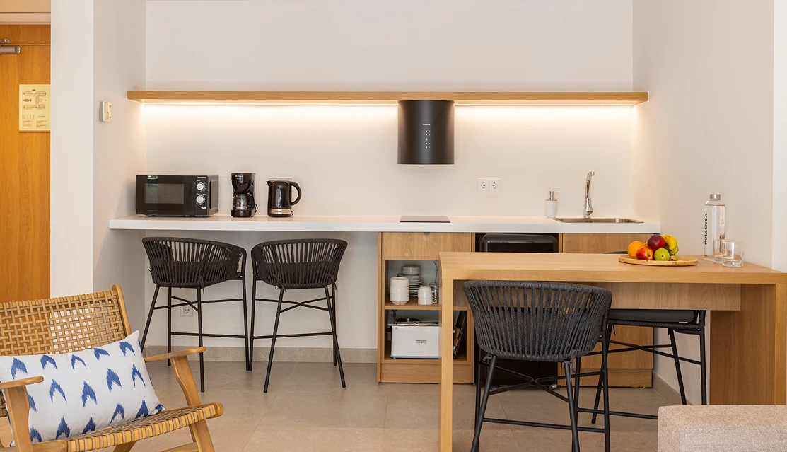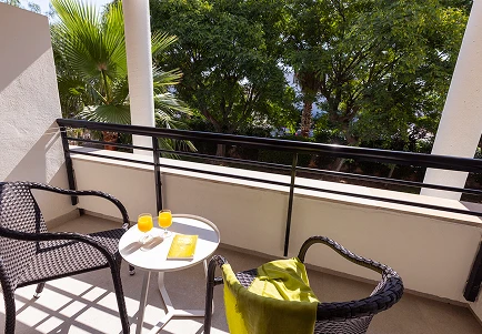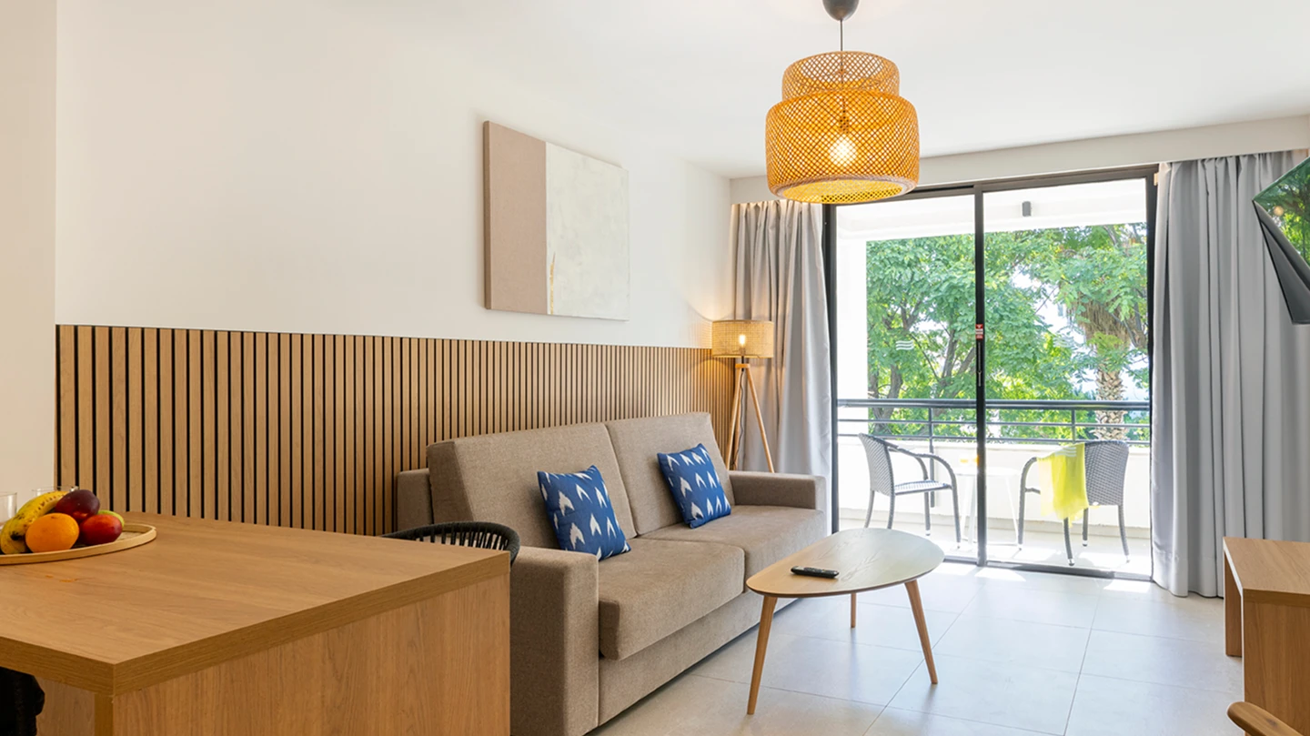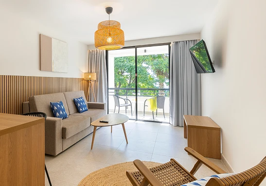 Apartamento de 43 m2 compuesto de habitación doble con dos camas individuales, equipada con TV de 32” y caja fuerte, tiene un salón con sofá cama doble, Smart TV de 40” y cocina americana con nevera, microondas y hervidor. El baño dispone de ducha a ras de suelo, secador y amenities. Todas las habitaciones tienen balcón con vistas a los jardines de los exteriores del hotel. Dispone wifi y aire acondicionado. Estas habitaciones están situadas en la primera planta del hotel con orientación sol mañana.