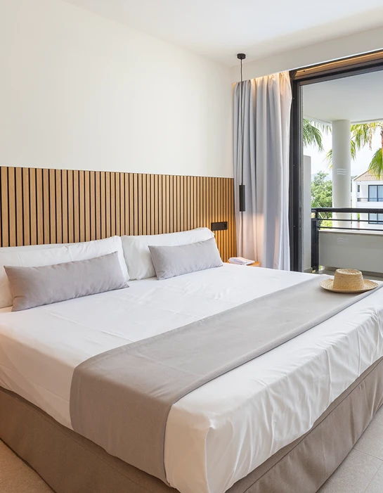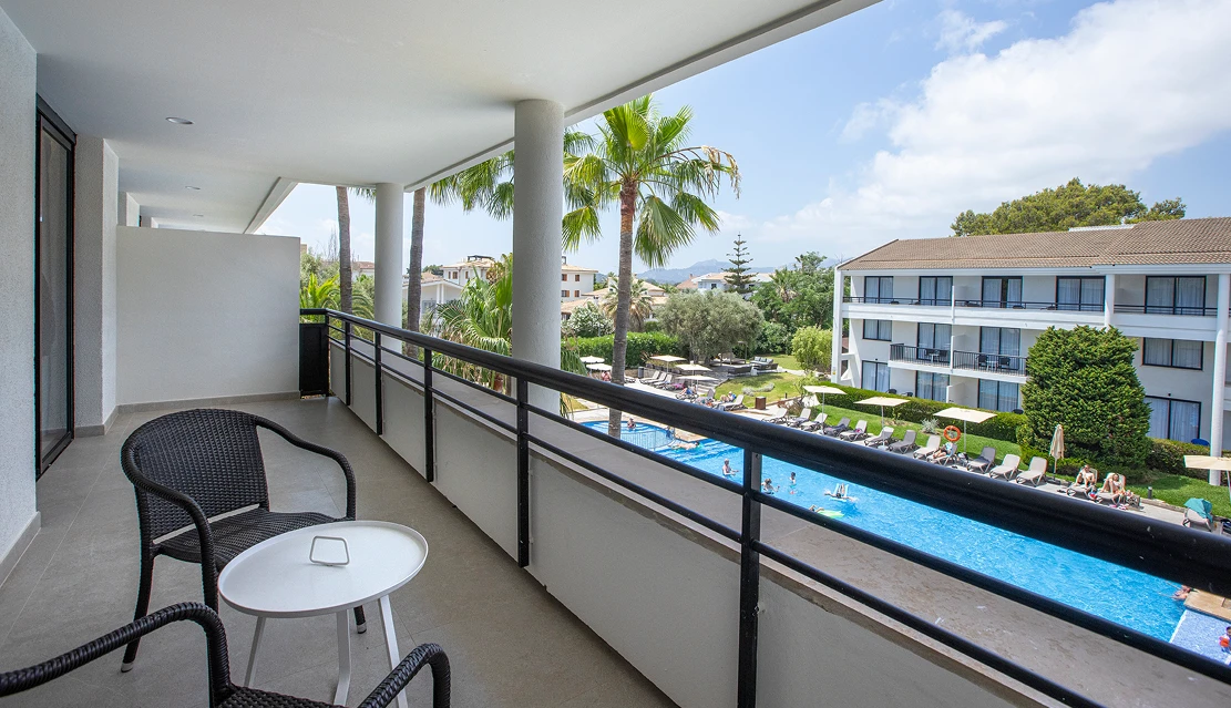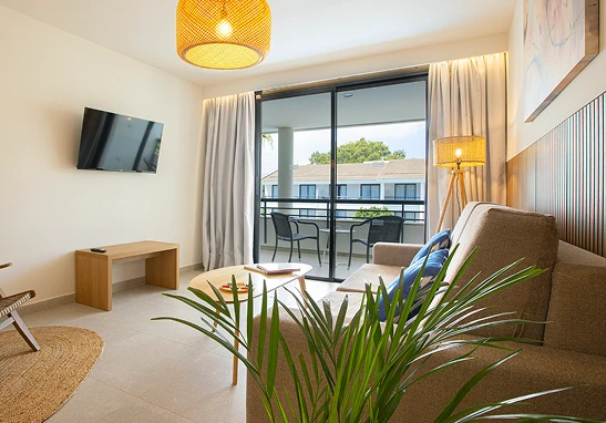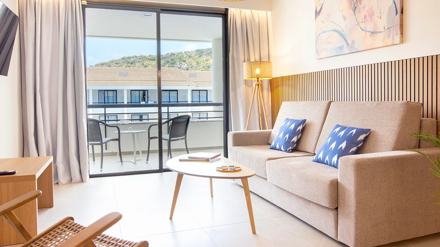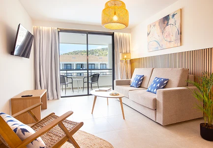 Suite de 43 m2 compuesta de habitación doble con cama queen o dos camas individuales, equipada con TV de 32” y caja fuerte, tiene un salón con sofá cama doble, mininevera, hervidor y Smart TV de 40”. El baño dispone de ducha a ras de suelo, secador y amenities. Todas las habitaciones tienen balcón con vistas a la piscina del hotel. Dispone wifi y aire acondicionado. Estas habitaciones están situadas en planta baja, primera y segunda planta del hotel.