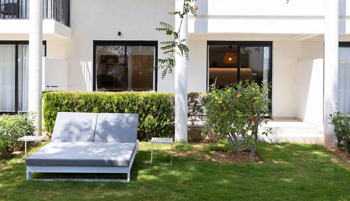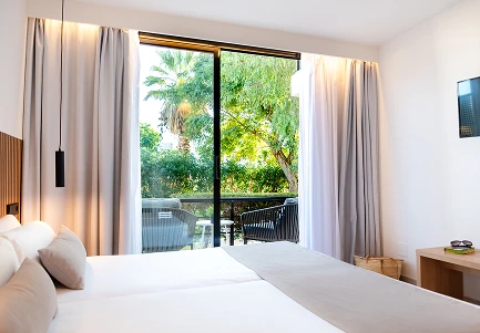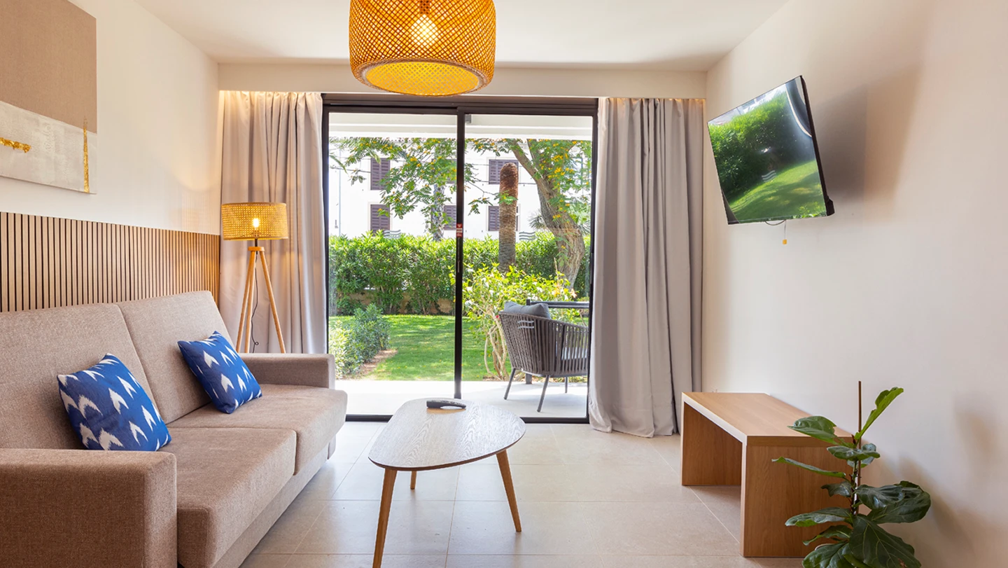 Suite de 50 m2 compuesta de habitación doble con dos camas individuales, equipada con TV de 32” y caja fuerte, tiene un salón con sofá cama doble, mininevera y hervidor. Escritorio y Smart TV de 40”. El baño dispone de ducha a ras de suelo, secador y amenities. Todas las habitaciones tienen terraza privada con tumbonas y acceso privado a zona de jardín de los alrededores del hotel. Dispone wifi y aire acondicionado.Estas habitaciones están situadas en planta baja del hotel con orientación sol mañana.